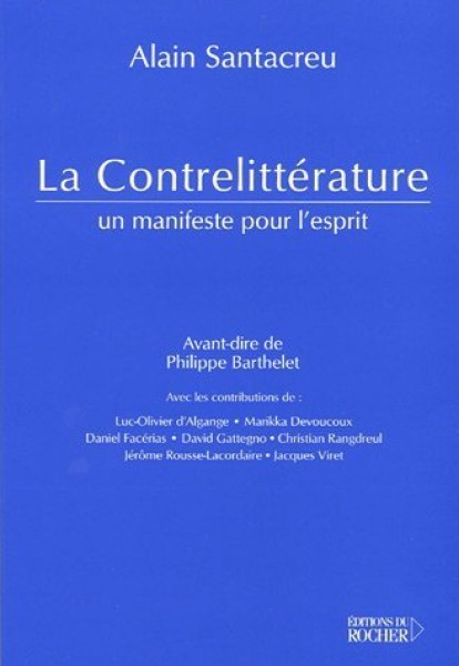Dès 1999, le Manifeste Contrelittéraire et la revue Contre littérature avait anticipé le mouvement culturel de grande envergure qui se dessine aujourd'hui dans le monde : l'émergence d'une authentique écologie de l'esprit. L'ambiguïté même du terme "contrelittérature" veut exprimer cette logique du paradoxe qui est celle de la pensée rebelle. Le combat du rebelle est un combat pour l'esprit. La finalité de l'art - Pourquoi l'art ? - pose le problème de l'homme : " Qu'est-ce que l'homme ? " Le retournement à une conception anthropologique ternaire - corps, âme, esprit - vise à réintroduire, sur les ruines de l'art moderne, la dimension spirituelle de la liberté. La littérature, au sens moderne, fut le choc en retour du rejet de la dimension mystique qui se mesure à la forclusion des textes de la mystique chrétienne, à l'effacement de la musique sacrée, à la disparition du tragique au théâtre. L'esprit demeurera toujours le "matériau le plus avancé" de l'art. En réintroduisant la mystique dans l'ordre artistique, la contrelittérature ouvre le futur d'une antériorité oubliée. Le Manifeste pour l'esprit tente de rétablir le sens obvie de l'art que le nihilisme avait arraisonné : les contrelittéraires combattront d'une main et construiront de l'autre !